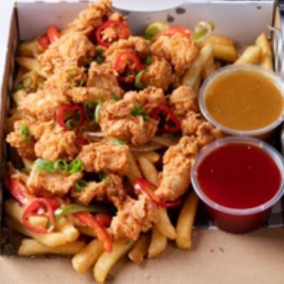 Crispy fries,Asty’s Fried chicken, grilled onion, peppers, spring onion, house curry sauce, sweet sour sauce, salt & chilli seasoning