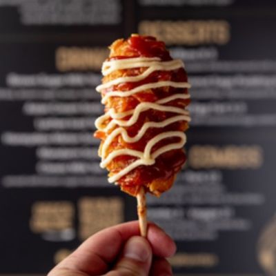 Cheese & Potato corn dog served with ketchup, mayo & sugar